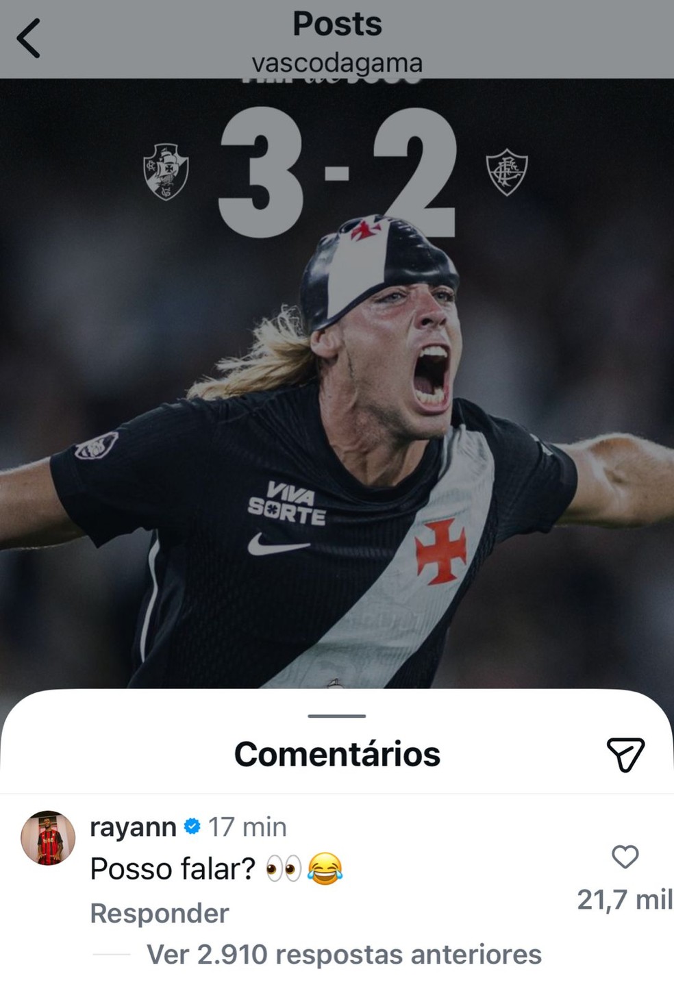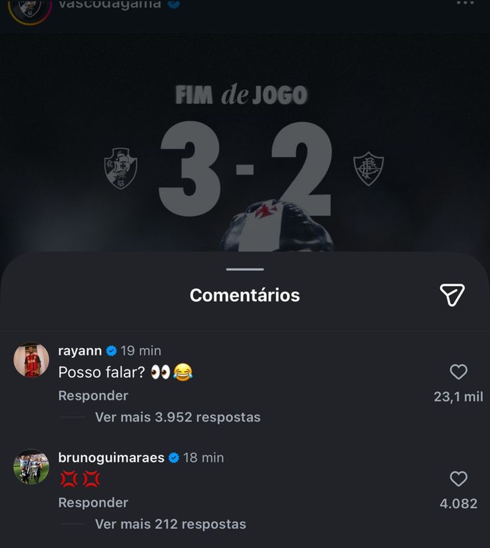 A vitória do Vasco sobre o Fluminense nesta quarta-feira, por 3 a 2, de virada, pelo Brasileirão, rendeu vários memes nas redes sociais. Após a partida, torcedores vascaínos provocaram os tricolores e até quem não está mais no clube entrou na onda. O atacante Rayan, que deixou o clube de São Januário para jogar no Bournemouth (Inglaterra), brincou sobre o resultado.