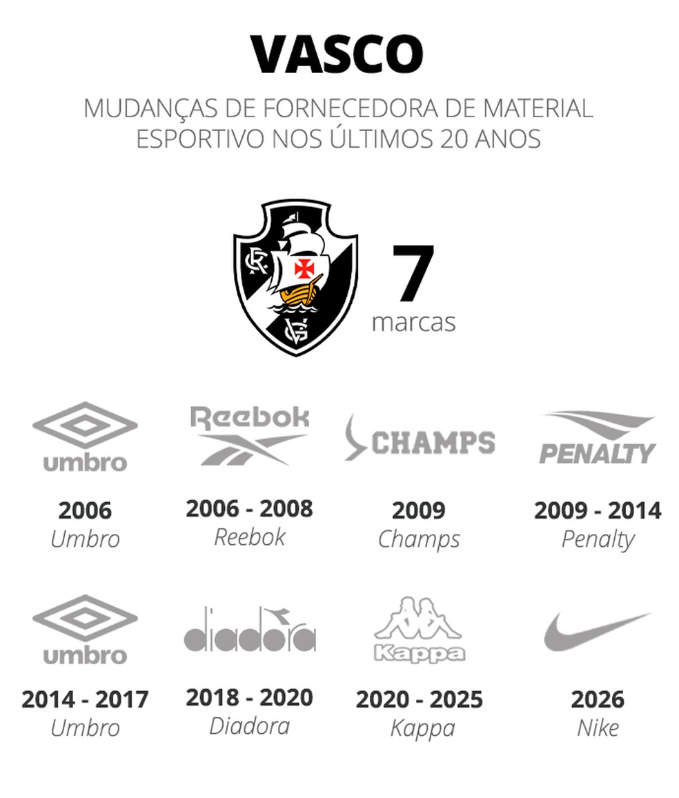 Vasco foi o 5º time da Série A que mais trocou de fornecedor de material esportivo nos últimos 20 anos: 7 vezes