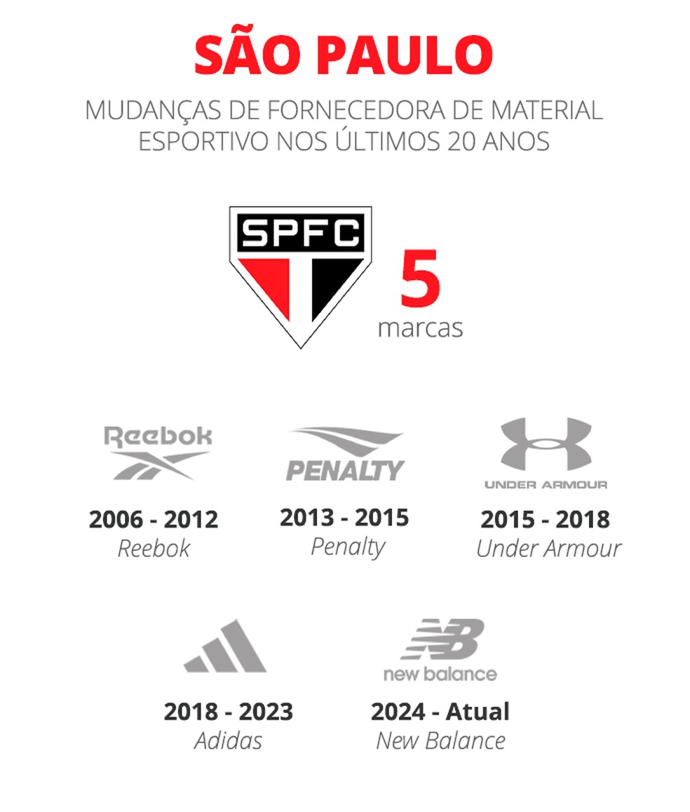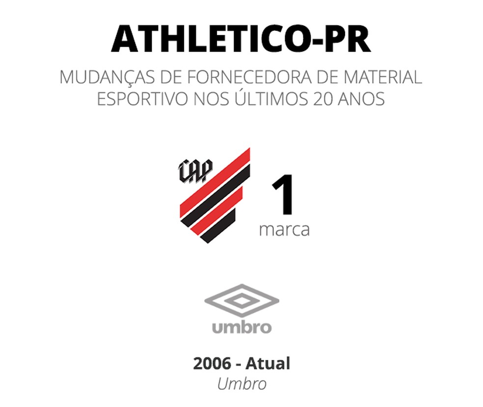 No entanto, o clube que tem há mais tempo o mesmo fornecedor de material esportivo é o Athletico-PR. A Umbro estampa a camisa do Furacão desde 1997. Prestes a completar 30 anos, o vínculo atual tem duração até o fim de 2029.