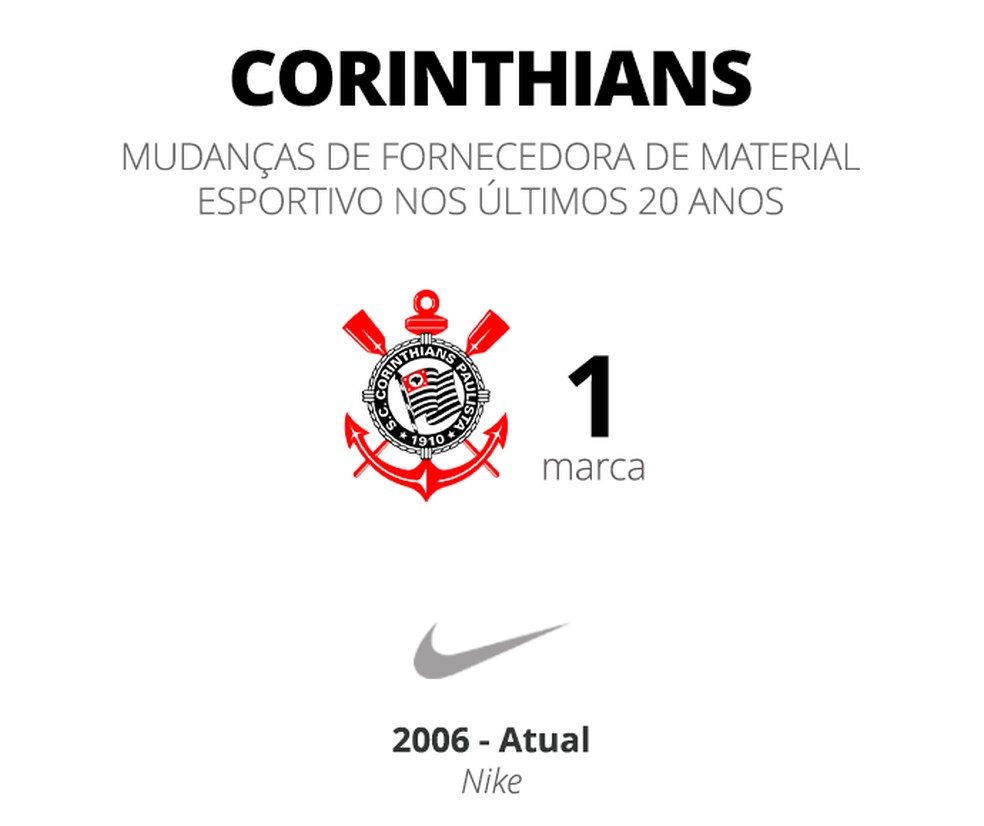 Por outro lado, dois times chamam atenção pela longevidade da parceria. Corinthians e Nike têm ligação desde 2003 e, no fim do ano passado, renovaram contrato por mais 10 temporadas, até 2036.