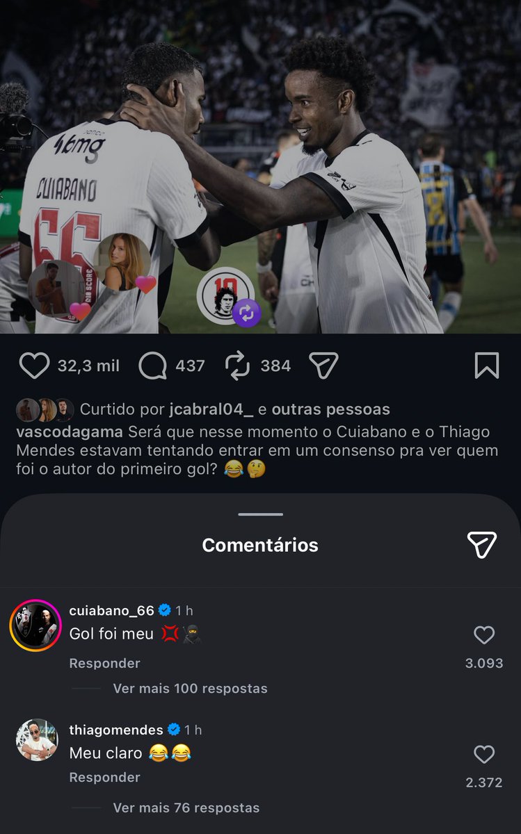 Cuiabano e Thiago Mendes debatem autoria do 1º gol do Vasco também no Instagram