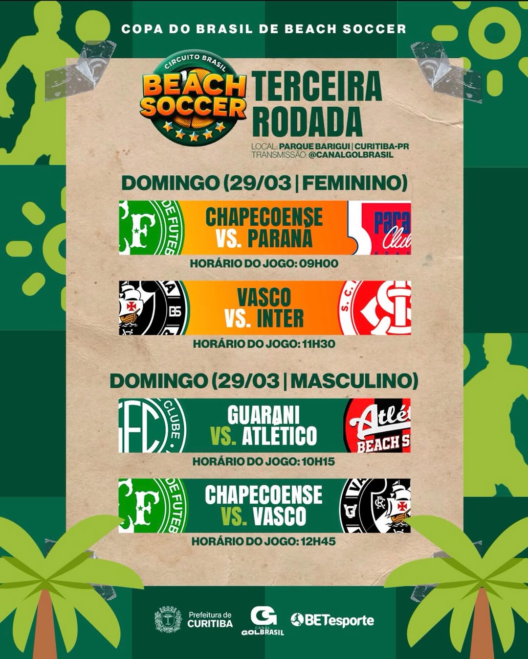 Neste domingo no Parque Barigui em Curitiba-PR a grande final da Copa do Brasil de Beach Soccer. Entrada gratuita.