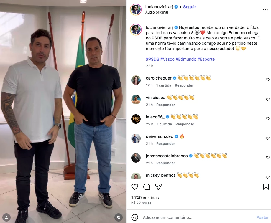 – Hoje estou recebendo um verdadeiro ídolo para todos os vascaínos! Meu amigo Edmundo chega no PSDB para fazer muito mais pelo esporte e pelo Vasco. É uma honra tê-lo caminhando comigo aqui no partido neste momento tão importante para o nosso estado – escreveu.