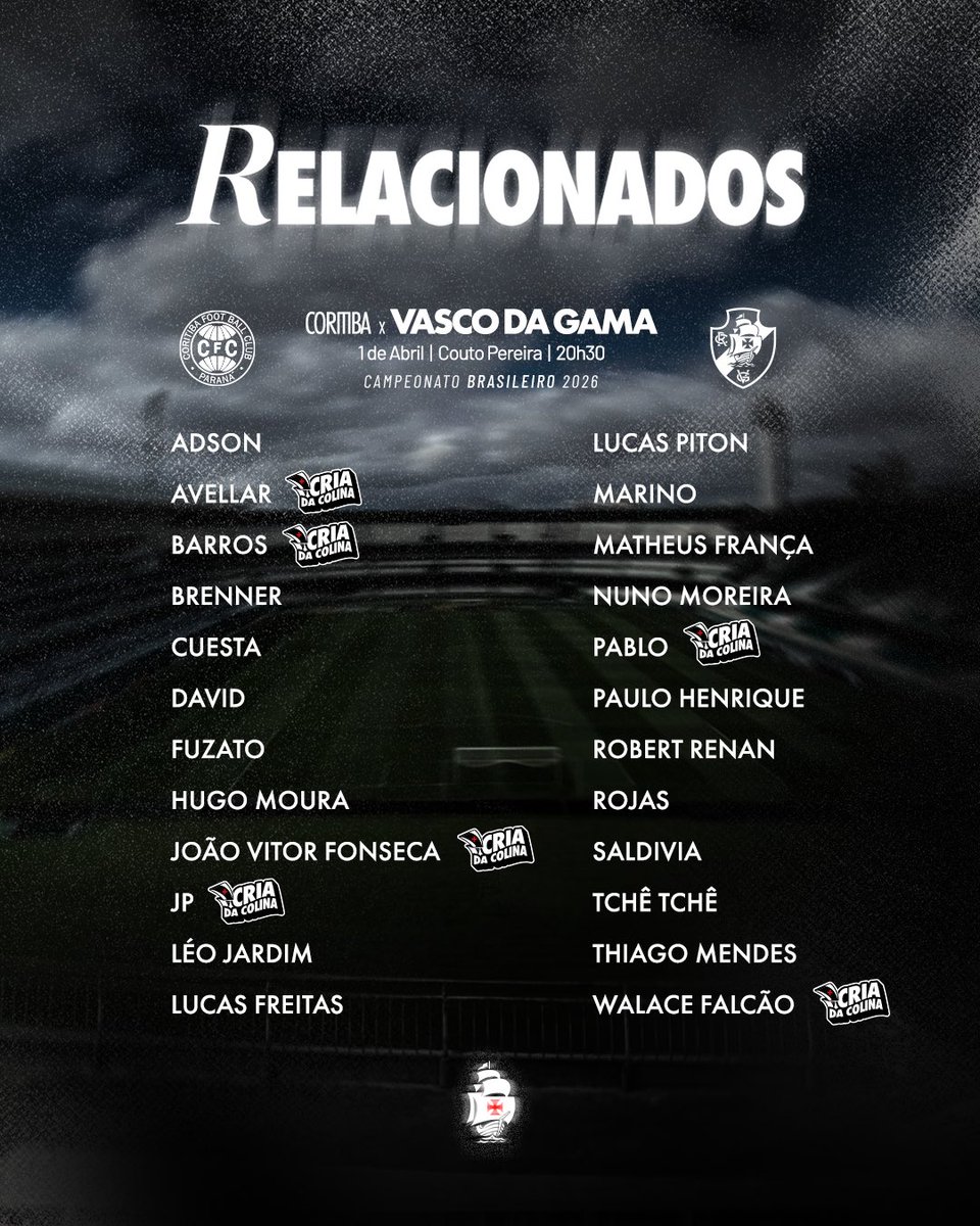 Vasco divulga os relacionados para o jogo contra o Coritiba