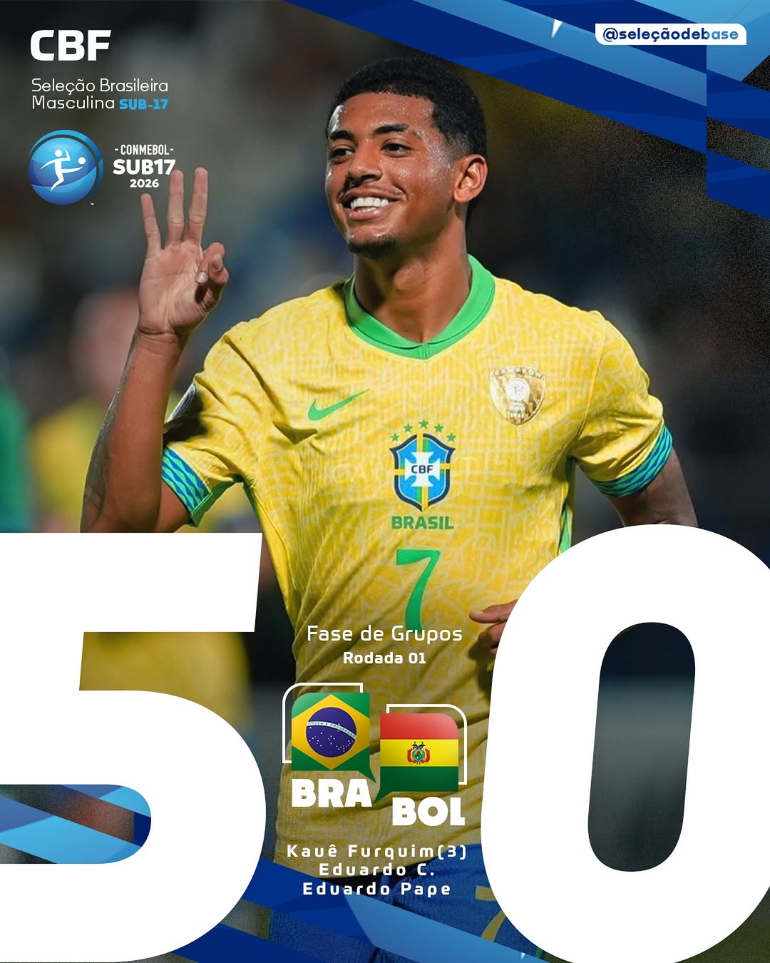 A Seleção Brasileira Sub-17 vence a Bolívia por 5 a 0 com gols de Kauê Furquim (3), Eduardo Conceição e Eduardo Pape.