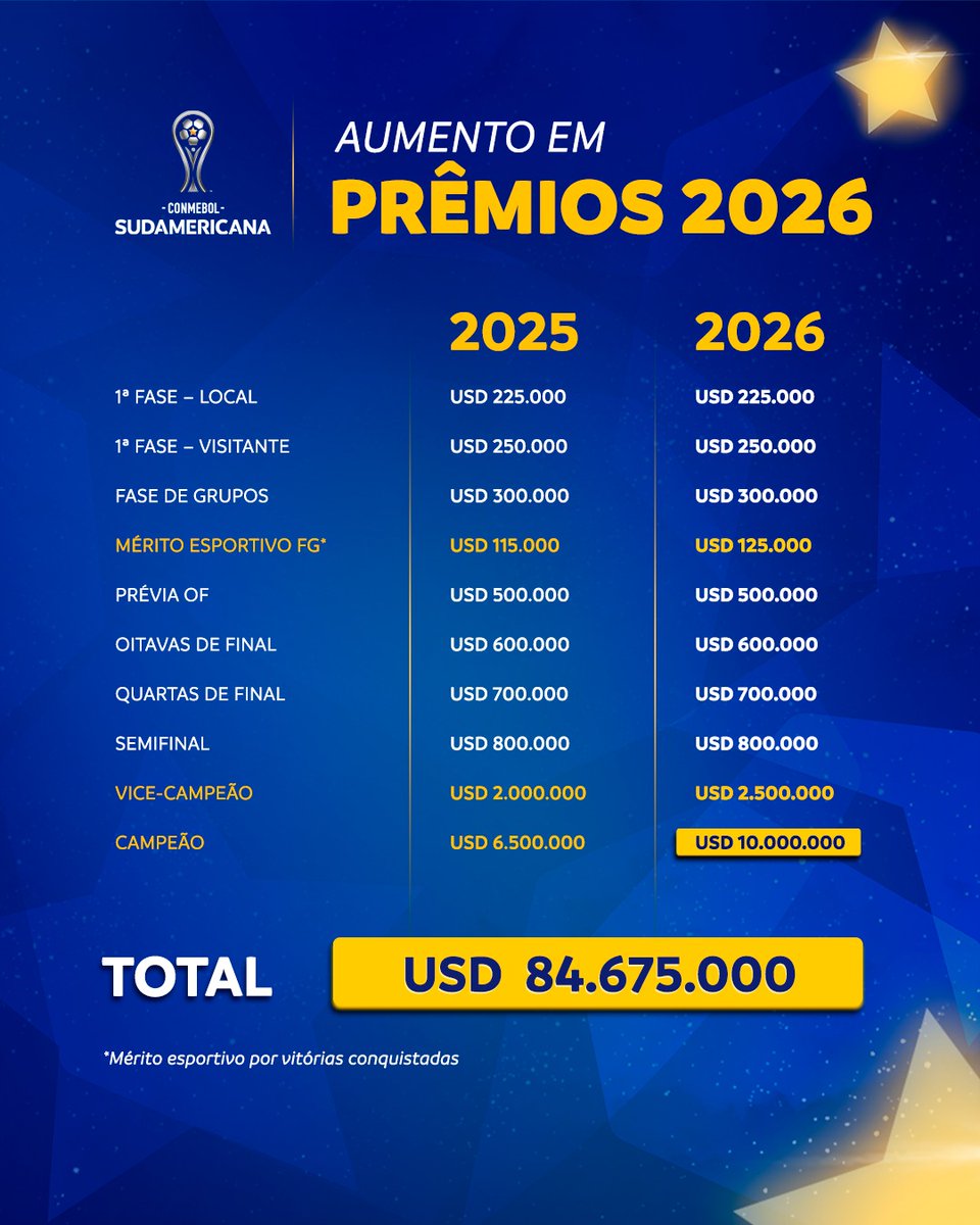 A @SudamericanaBR anuncia um aumento na premiação da Copa Sul-americana desse ano em comparação a 2025. Confira os valores atuais: