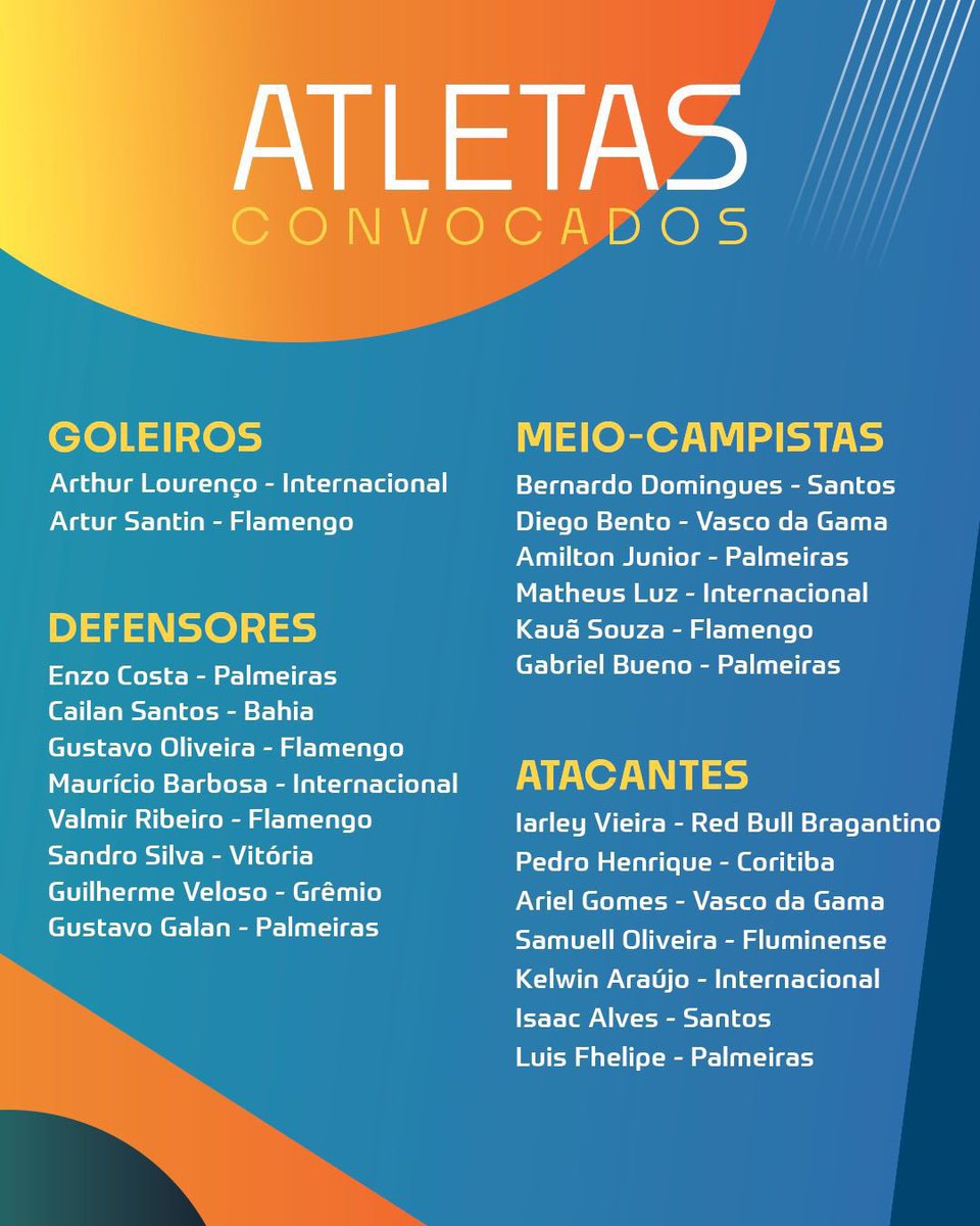 O meia-atacante Ariel Gomes e o meia Diego Bento foram convocados pelo técnico Guilherme Dalla Déa para treinos entre os dias 13 a 22 de abril visando a preparação para o torneio Vlatko Markovic na Croácia.