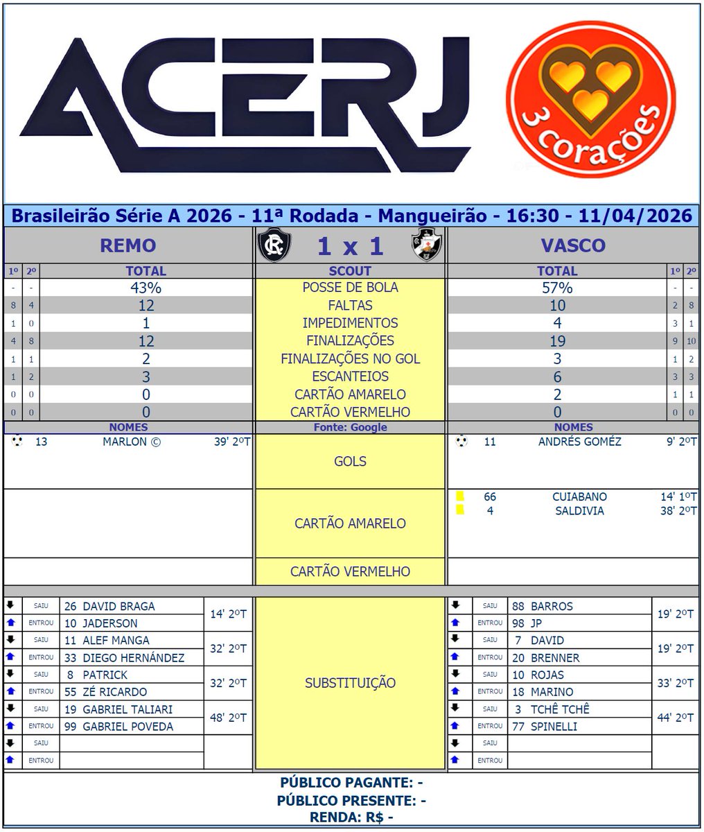 O Vasco empatou com o Remo em 1 a 1 neste sábado (11), no Mangueirão, pela 11ª rodada do Campeonato Brasileiro, com gols de Andrés Gómez e Marllon. O início da partida foi atrasado em 30 minutos devido às fortes chuvas que atingiram Belém. Os times protagonizaram um jogo com muita disputa no meio-campo: o Cruz-Maltino teve mais posse de bola, mas apresentou dificuldades para criar na primeira etapa, até conseguir ter chances perigosas no segundo tempo. No entanto, a equipe de Renato Gaúcho sofreu o gol de empate ao fim da partida.