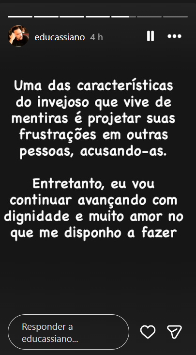 Eduardo Cassiano: 'Vou continuar avançando com dignidade e muito amor no que me disponho a fazer'
