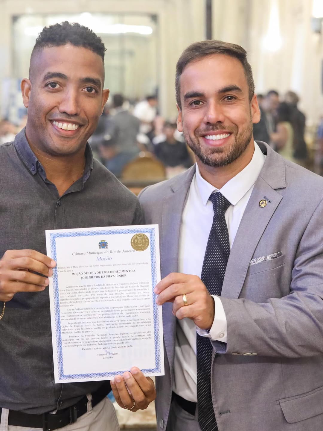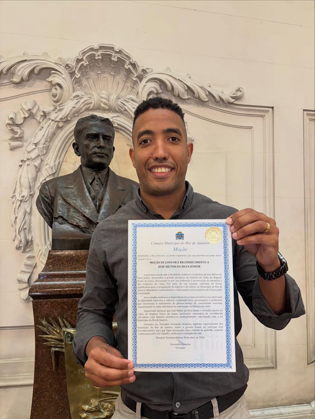 Hoje meu coração vascaíno transborda de gratidão: recebi uma moção de homenagem da Câmara Municipal do Rio de Janeiro, por ocasião do Dia do Vascaíno, no aniversário do grande Roberto Dinamite, em reconhecimento ao meu trabalho de pesquisa e produção sobre a linda história do Club de Regatas Vasco da Gama. Saber que minha dedicação em preservar e contar nossa memória contribui para o futebol além das quatro linhas é motivo de grande orgulho. Agradeço especialmente ao vereador Fernando Arrmelau pelo reconhecimento e por incluir meu nome entre tantos torcedores ilustres do Vasco. Seguimos juntos, mantendo viva a história e a paixão pelo nosso Gigante da Colina. Obrigado, Vasco! Obrigado, torcedor cruz-maltino!!!💢💢💢 #vascodagama #historiamaislindadofutebol #futebol #historia #camisasnegras