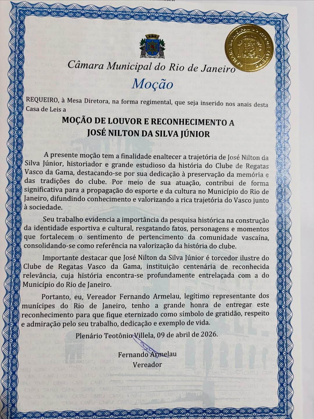 Receber uma Moção de Louvor e Reconhecimento pelo trabalho que desenvolvo na comunicação do Vasco da Gama, em um dia tão simbólico para o clube, em que se celebra a trajetória do #MaiorDeTodos, é algo muito gratificante e que me emociona profundamente.