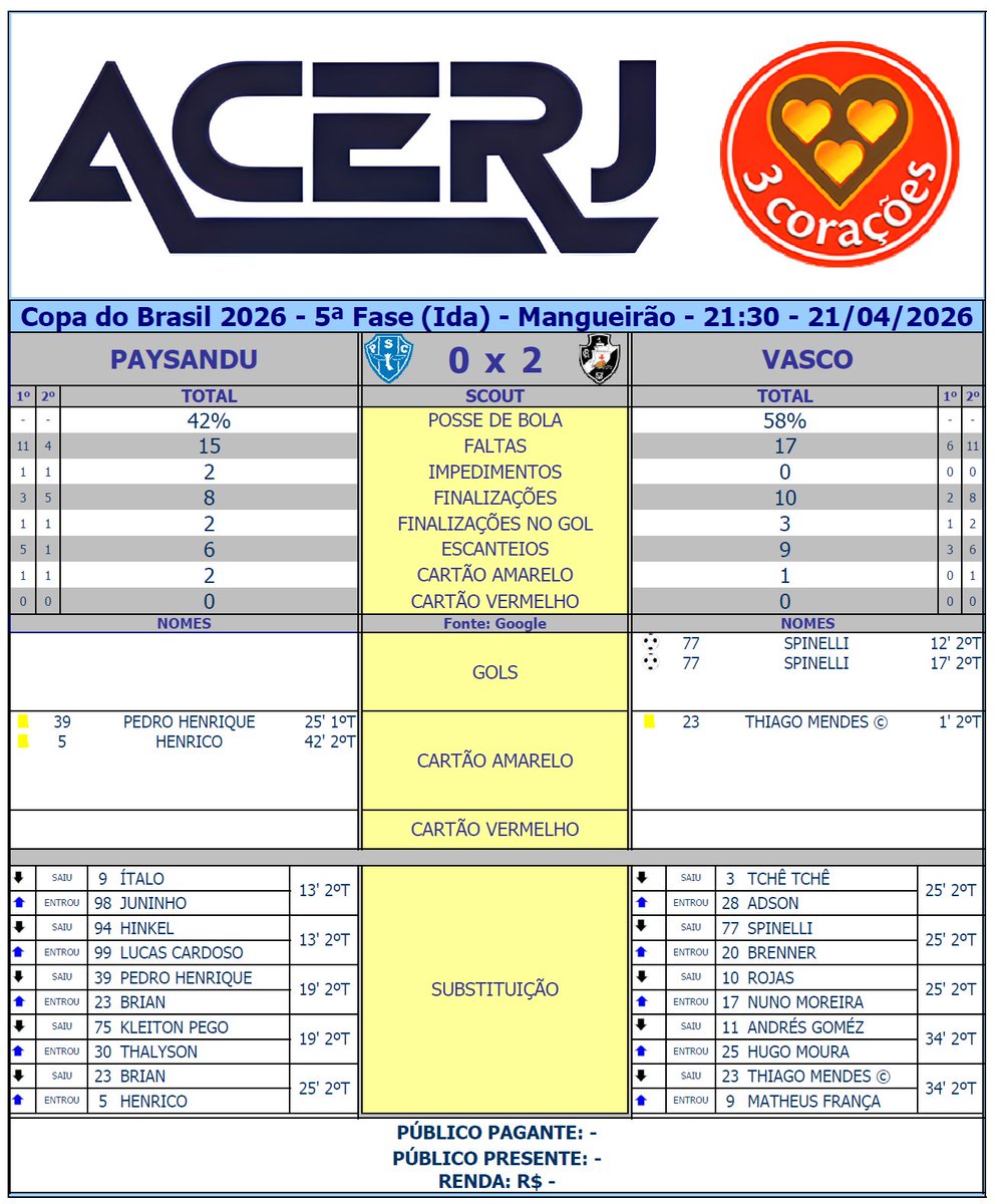 Cartão Amarelo: Pedro Henrique, Henrico (PAY), Thiago Mendes (VAS)