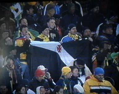 Enquanto o hino nacional brasileiro era executado no estádio Ellis Park, em Johanesburgo, na África do Sul, minutos antes da estreia do Brasil na Copa do Mundo 2010, contra a Coreia do Norte, nesta terça-feira (15/06), as câmeras da TV que gera as imagens da competição para todo o mundo exibiram torcedores segurando uma bandeira do Vasco.