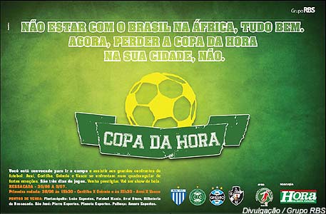 Uma campanha publicitária está convidando a torcida para assistir aos jogos da Copa da Hora - campeonato amistoso entre Avaí, Coritiba, Grêmio e Vasco promovido pelo Grupo RBS, jornal Hora de Santa Catarina e Federação Catarinense de Futebol. As peças, criadas pela agência OneWG, já estão sendo exibidas em TV, rádio, jornal e Internet.