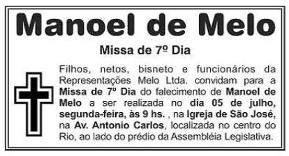 Missa de 7º dia do grande benemérito Manoel de Melo será dia 05/07 às 9h
