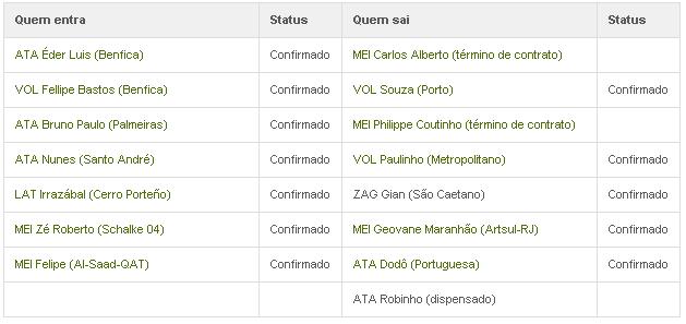Para deixar o internauta por dentro das contratações e dispensas, o GLOBOESPORTE.COM mostra a movimentação no mercado dos 20 principais clubes da Primeira Divisão. Muitos jogadores foram repatriados, como Renato Abreu ( do Al Shabab-EAU para o Flamengo), Felipe (do Al Saad-QAT para o Vasco), Tinga (do Borussia Dortmund-ALE para o Inter) e Emerson ‘Sheik’ ( do Al Ain – EAU para o Fluminense). Até o treinador pentacampeão do mundo voltou, caso de Luiz Felipe Scolari, que reassumiu o Palmeiras.