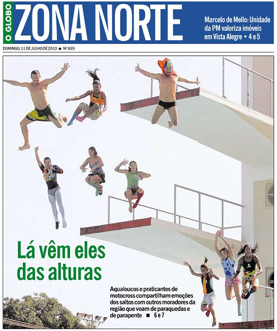 E, quando se trata de viver nas alturas, o assunto é perfeito para um morador da Penha que é instrutor de parapente e para outro, de Oswaldo Cruz, que dá aulas de paraquedismo. Com os rostos maquiados, atletas e veteranos de saltos ornamentais levantam arquibancadas como aqualoucos. Sozinhos ou em grupos, eles pulam na piscina com fantasias para lá de irreverentes. Entre elas, personagens como Superman.