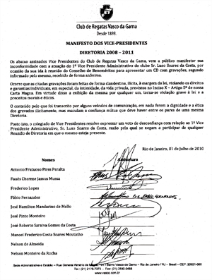 "O abaixo-assinado dos vice-presidentes do Club de Regatas Vasco da Gama vem a público manifestar sua inconformidade com a atuação do 1º Vice-Presidente Administrativo do clube, Sr. Luso Soares da Costa, por ocasião da sua ida à reunião do Conselho de Beneméritos para apresentar um CD com gravações, segundo informado pelo mesmo, recebido de forma anônima.