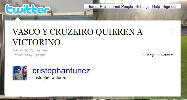 De acordo o twitter do jornalista chileno Christopher Antunez, jornalista que acompanha a Universidad de Chile, Vasco e Cruzeiro estariam na briga pelo zagueiro Mauricio Victorino, da seleção uruguaia.