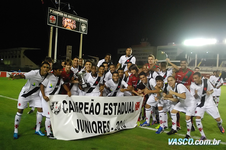 Os Juniores do Vasco estão neste momento comemorando o título estadual no gramado de São Januário. A torcida grita "é campeão".