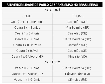Paulo César Gusmão soube dar continuidade no trabalho que iniciou no Ceará nas primeiras rodadas do Campeonato Brasileiro no Vasco. Após trabalhar por sete jogos na equipe de Fortaleza e conquistar cinco vitórias e três empates, o técnico aceitou o desafio de tentar tirar o Gigante da Colina da zona de rebaixamento. Em três jogos, ele já conseguiu um triunfo e duas igualdades no marcador, todas fora de casa (contra Goiás, no Serra Dourada, e Grêmio, no Olímpico).