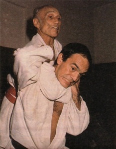 Mestre Hélio Gracie aplica uma guilhotina em Pedro Valente. Tempos da academia Gracie, na Sede Náutica da Lagoa.