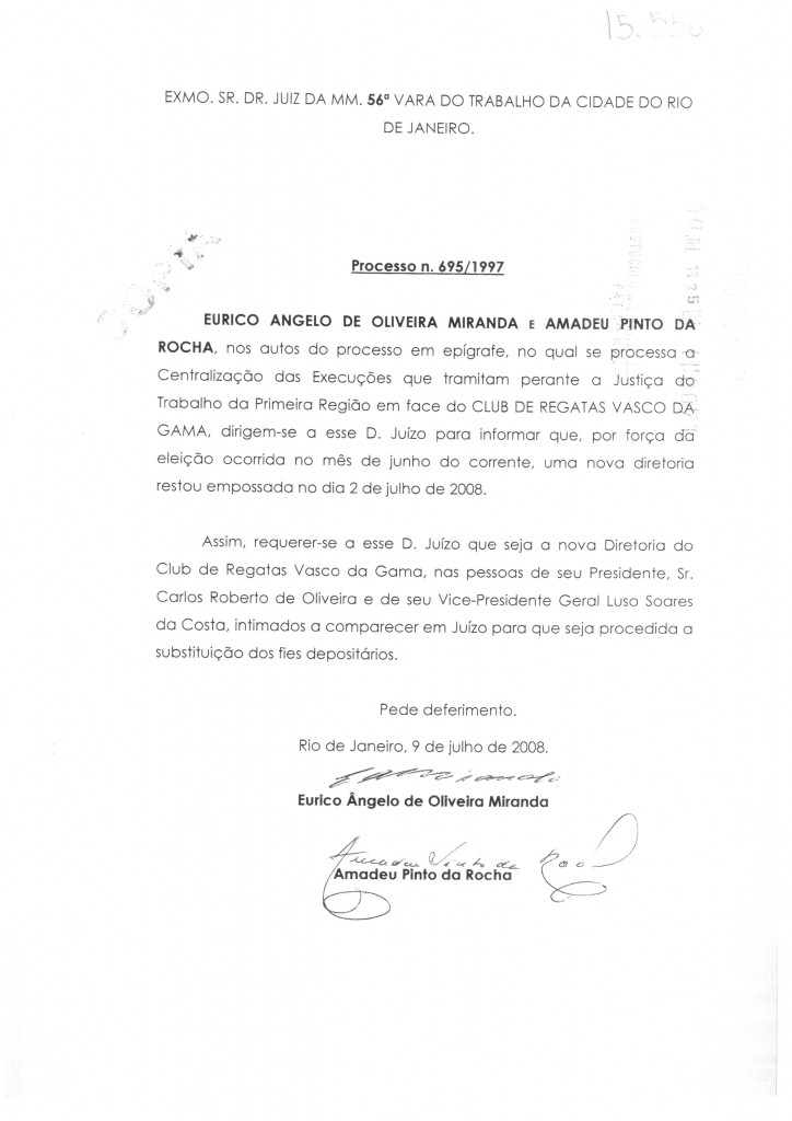 Em julho de 2008, o Presidente do Vasco, Eurico Miranda, e seu Primeiro Vice-presidente, Amadeu Pinto da Rocha, comunicaram ao juízo que, em virtude do processo eleitoral então ocorrido, deixaram de ser fiéis depositários do acordo celebrado entre o Vasco e o TRT-RJ para pagamento gradativo do passivo trabalhista do clube.