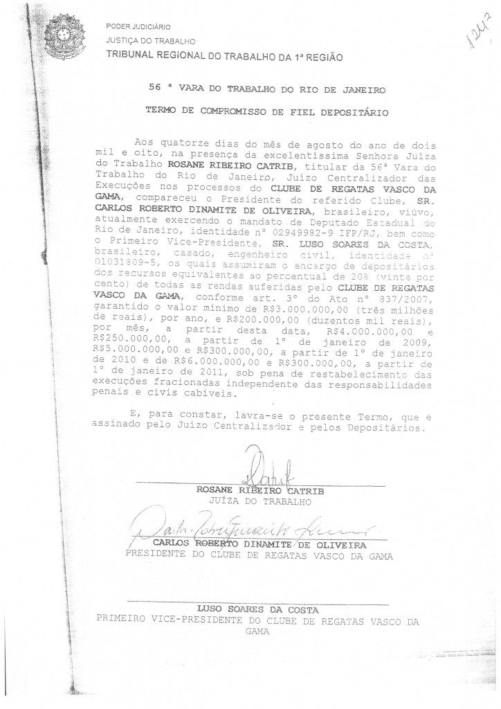 Em substituição a Eurico Miranda e Amadeu Pinto da Rocha, assinou o Termo de Compromisso de Fiel Depositário em 14.08.2008 o senhor Carlos Roberto Dinamite de Oliveira, novo “presidente” do clube. Também deveria assiná-lo o senhor luso Soares da Costa, 1° Vice-Presidente Geral, mas tal fato não ocorreu. Certamente, o senhor Luso já vislumbrava o futuro.