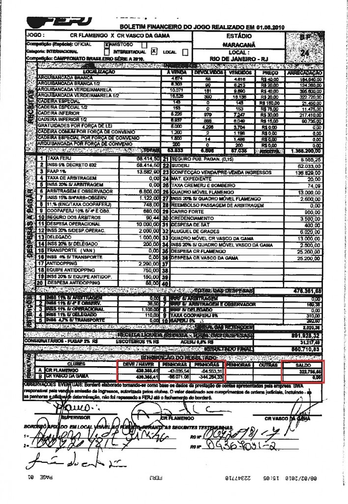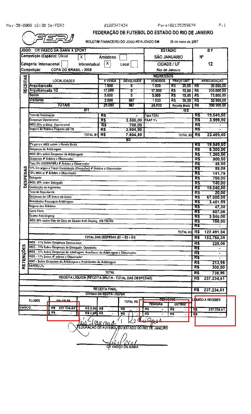 A fim de se comprovar que o clube cumpria o acordo com o TRT até junho de 2008, reproduzimos abaixo o borderô da partida Vasco x Sport Recife, disputada no dia 28.05.2008 em São Januário, semifinal da Copa do Brasil. Não há indício de penhora.