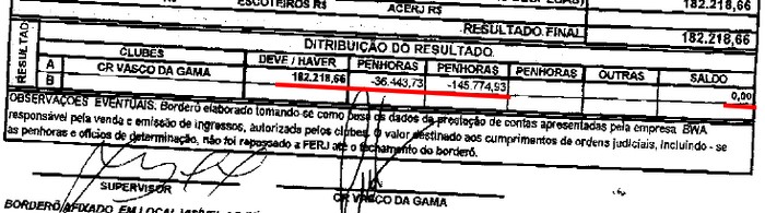 A exemplo do que aconteceu no clássico contra o Flamengo, pela 12ª rodada do Campeonato Brasileiro, o Vasco teve a renda da partida contra o Vitória integralmente penhorada. O borderô da partida, divulgado pelo site da CBF, confirma a penhora integral da arrecadação.