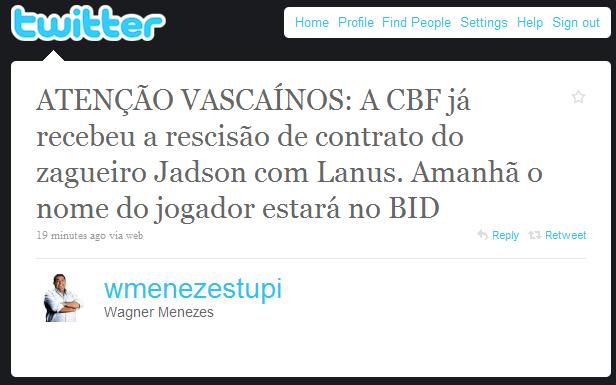 Fonte: NETVASCO (texto), Twitter Wagner Menezes (imagem)