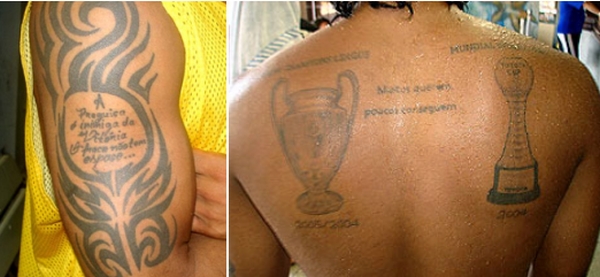 - No braço direito, dentro de um desenho tribal, existe a frase: “A preguiça é inimiga da vitória, o fraco não tem espaço…”, o verso da música “Sou mais você”, do grupo ‘Racionais MC´s’;