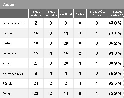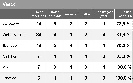 VASCO: Fernando Prass; Fagner, Dedé, Fernando e Carlos Alberto; Nilton, Rafael Carioca, Rômulo (Alan, 24'/2ºT) e Felipe (Carlinhos, 20'/2°T); Zé Roberto e Éder Luís. Técnico: PC Gusmão.