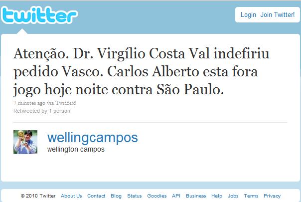 Não demorou muito tempo e o Superior Tribunal de Justiça Desportiva (STJD) deu a resposta do pedido de efeito suspensivo do jogador Carlos Alberto, do Vasco. Porém, a resposta não foi a que o clube esperava. O vice-presidente do tribunal, Virgílio Val, indeferiu o pedido e o jogador não poderá contra o São Paulo, nesta quarta-feira, dia 25 de agosto.