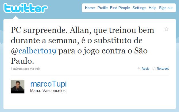 Rádio Tupi, o técnico PC Gusmão escolheu o jovem Allan para substituir o capitão Carlos Alberto, suspenso, para a partida desta quarta-feira (25/08), contra o São Paulo.
