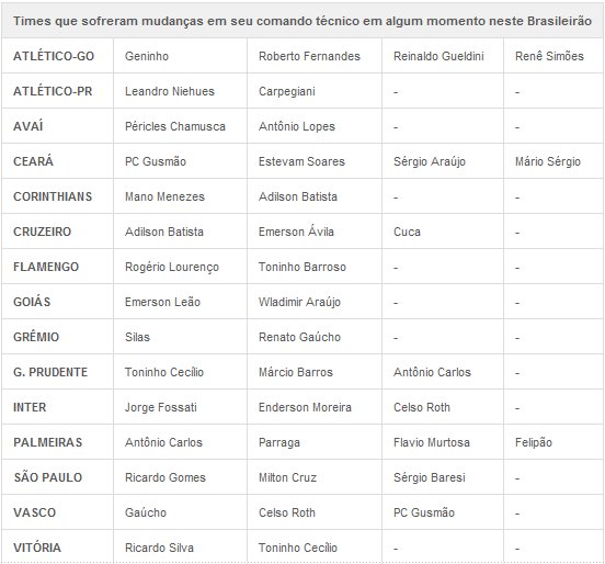 Esses números levam em consideração apenas as mudanças dos técnicos principais e dos interinos que tenham sido efetivados no cargo. A conta fica ainda mais expressiva se incluirmos também os treinadores provisórios, que ficaram algum tempo dirigindo as equipes até que o "oficial" assumisse a missão. No total, seriam 26 mudanças, todas incluídas na tabela que segue mais abaixo.