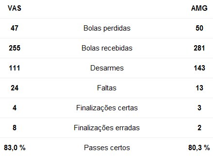 O Vasco também levou perigo em uma bola parada. Aos 24, Fellipe Bastos mandou uma bomba de longe e Fábio Costa não conseguiu segurar na primeira. Ninguém do time da Colina conseguiu aproveitar o rebote.