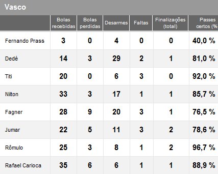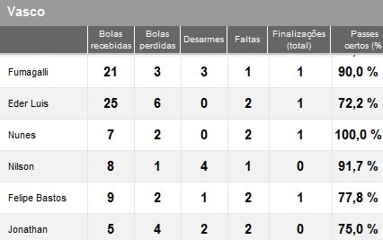 VASCO: Fernando Prass; Fagner, Dedé, Titi e Jumar; Nilton, Rafael Carioca, Rômulo e Fumagalli (Fellipe Bastos, 15'/2ºT); Éder Luís (Jonathan, 24'/2ºT) e Nunes (Nilson, 10'/2ºT). Técnico: PC Gusmão