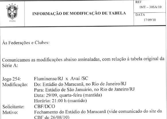 CBF transfere Fluminense x Avaí, dia 29/09, para São Januário