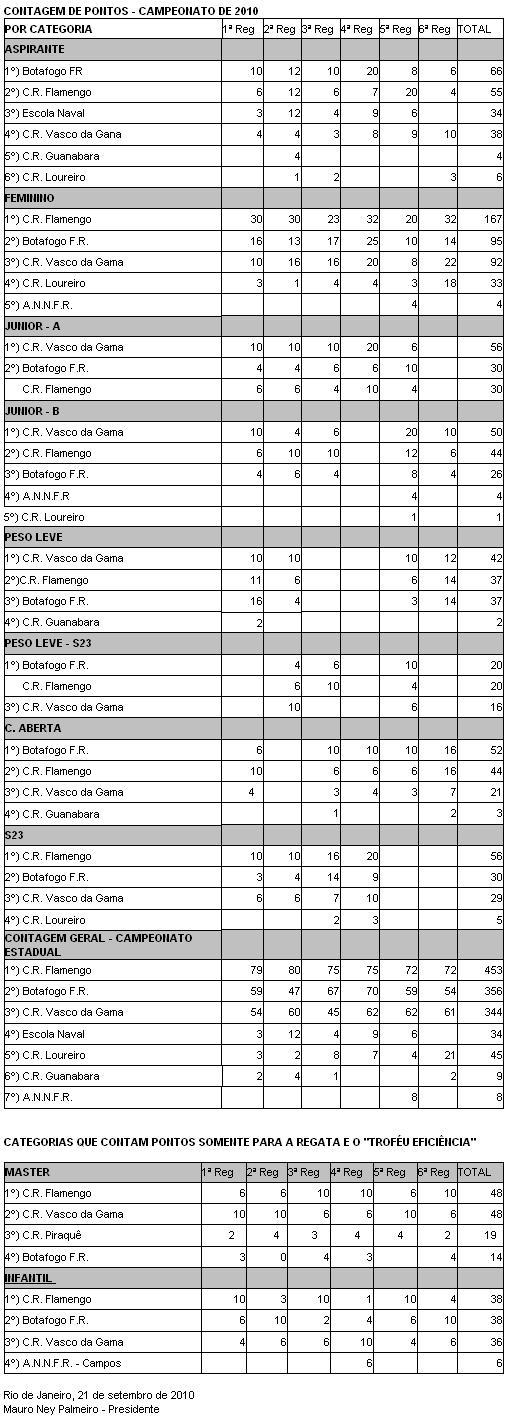 Foi aprovada, pela Comissão de Arbitragem, a 6ª REGATA OFICIAL DO CAMPEONATO DO ESTADO DO RIO DE JANEIRO, realizada no dia 19 de setembro de 2010, na Lagoa Rodrigo de Freitas cujo resultado foi o seguinte: