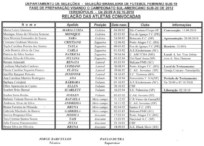 A Seleção Brasileira Feminina Sub-18, que foi convocada pelo técnico Jorge Barcellos para a fase de preparação visando ao Sul-Americano da categoria, se apresenta nesta segunda-feira, dia 20 de setembro, no Aeroporto Santos Dumont.