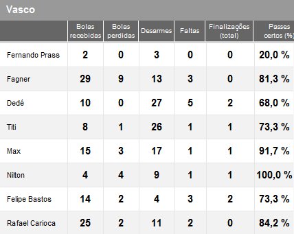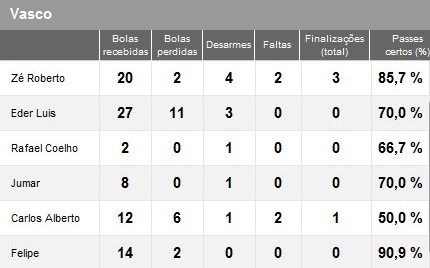 VASCO: Fernando Prass; Fagner, Dedé, Titi, Max; Rafael Carioca, Nilton (Jumar 43/2º), Fellipe Bastos (Felipe 21/2º) e Zé Roberto; Éder Luis e Rafael Coelho (Carlos Alberto, intervalo). Técnico: Paulo César Gusmão.