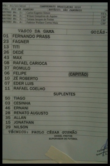 Confira abaixo a escalação do Vasco para a partida contra o Goiás, publicada no twitter do assessor de imprensa do Vasco (@viniciuscrvg):