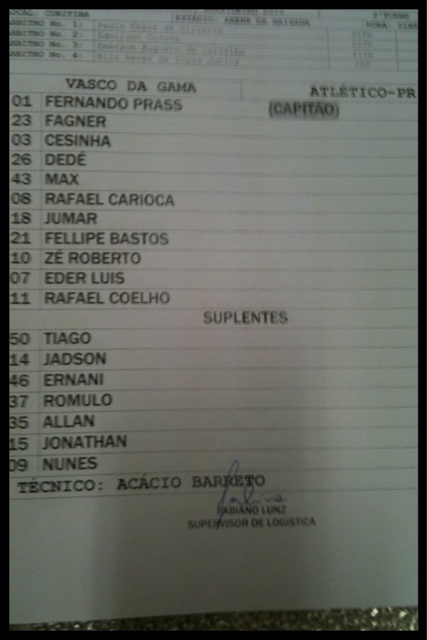 Devido à suspensão de PC Gusmão, pela primeira vez o ex-goleiro cruzmaltino Acácio será oficialmente o técnico do time do Vasco. Na década de 80, quando os dois ainda atuavam sob as traves, Paulo César Gusmão era o reserva de Acácio. Confira a formação que enfrentará o Atlético-PR, daqui a pouco, na Arena da Baixada: