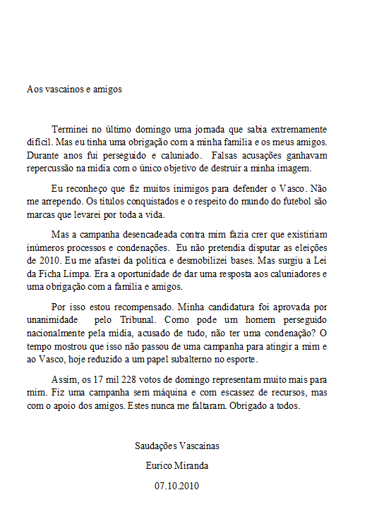 O presidente do Conselho de Beneméritos do Vasco Eurico Miranda, que se candidatou a deputado federal nas eleições 2010 mas não se elegeu, divulgou em seu site (http://www.euricomiranda.com.br) a seguinte mensagem: