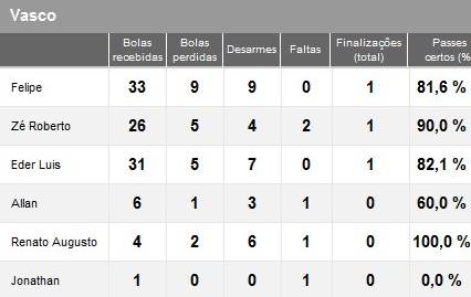 VASCO: Fernando Prass, Irrazábal, Cesinha, Dedé e Carlinhos (Renato Augusto - 27'/2ºT); Jumar, Rafael Carioca, Fellipe Bastos (Allan - 21'/2ºT) e Felipe; Zé Roberto (Jonathan - 45'/2ºT)e Eder Luis. Técnico: Paulo César Gusmão.