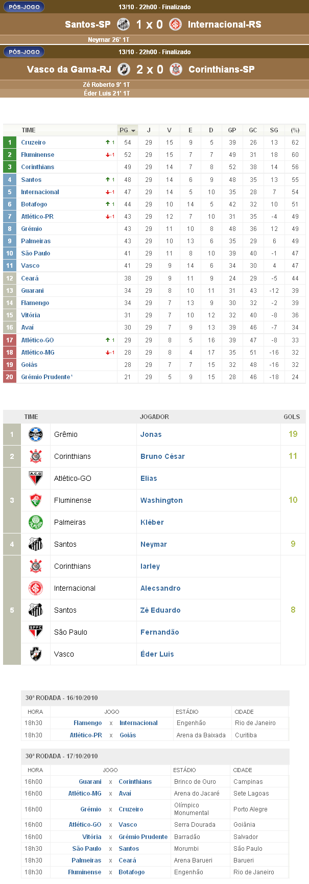 No outro jogo pendente, o Santos derrotou o Internacional por 1 a 0. Agora, todos os times têm o mesmo número de jogos na competição: 29.