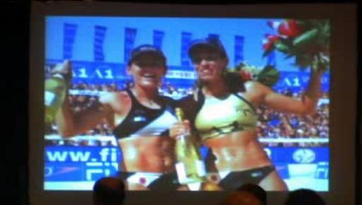 Telão exibe imagens de Shelda e Adriana em ação com o uniforme do Vasco