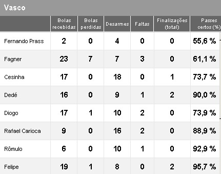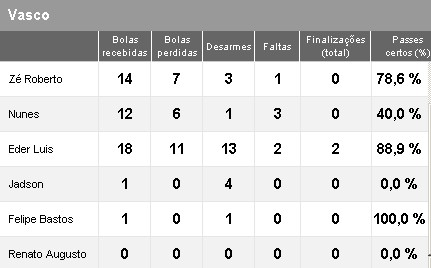 VASCO: Fernando Prass, Fagner, Cesinha, Dedé e Diogo; Rafael Carioca, Rômulo, Felipe (Felipe Bastos - 28'/2ºT); Zé Roberto (Jadson Vieira 23'/2ºT), Eder Luis e Nunes. Técnico: Paulo César Gusmão