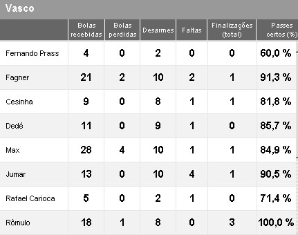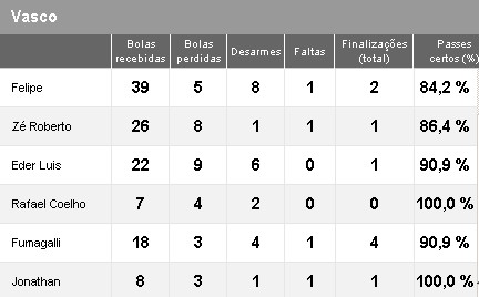 VASCO: Fernando Prass, Fagner, Cesinha, Dedé e Max; Rafael Carioca (Rafael Coelho - 18'/1ºT ) (Fumagalli - Intervalo), Jumar, Fumagalli e Felipe; Zé Roberto e Eder Luis (Jonathan - 20'/2ºT). Técnico: PC Gusmão